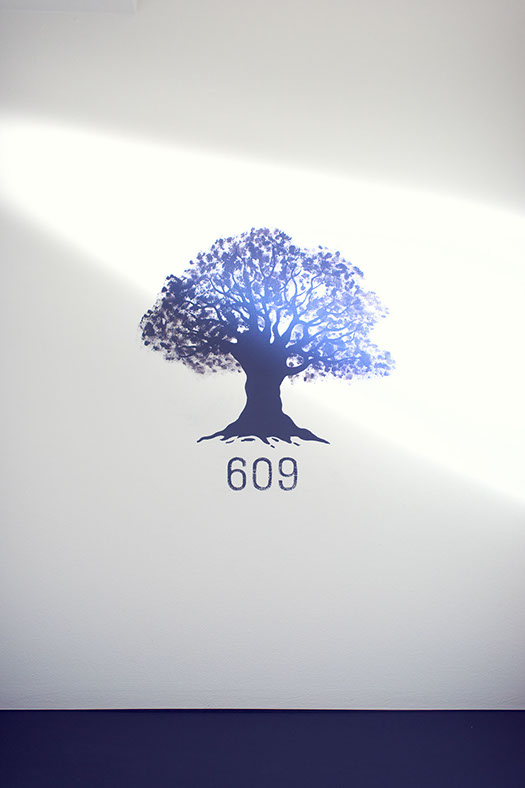 エントランスホールには白樺とアーティフィシャルフラワーを用いた意匠